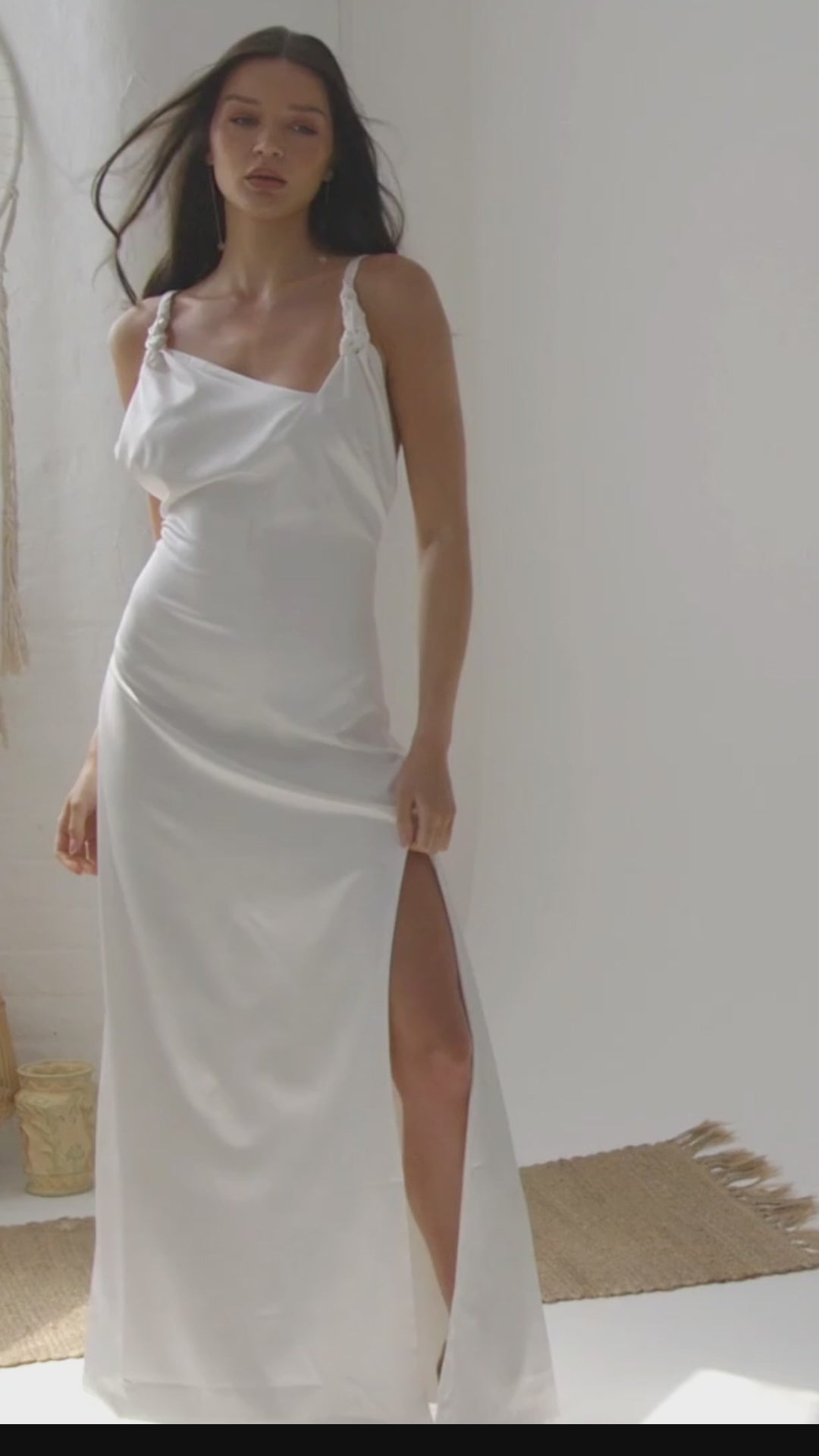 The Roya asymmetric maxi dress is the epitome of elegance. Crafted from silky satin in a refined ivory white hue, this show-stopping gown features a daring thigh-high slit and a sleek backless design that skims the figure for an ultra-sultry finish. Twisted adjustable spaghetti straps and an asymmetric neckline complete the look, making Roya the ultimate statement dress for weddings, galas, and red-carpet occasions.