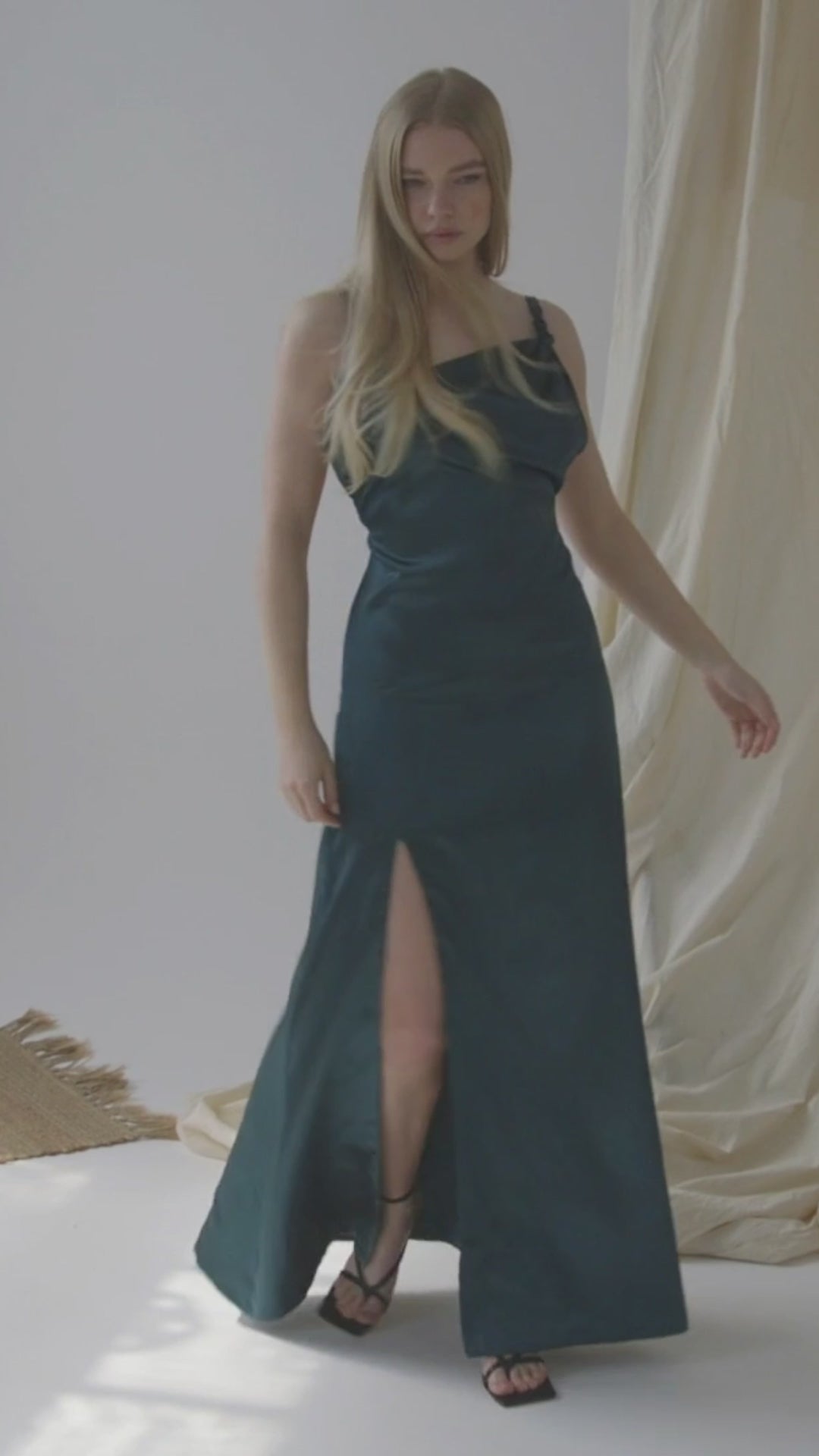 The Roya emerald green maxi dress is an effortlessly elegant show-stopper. Crafted from silky satin in a deep emerald hue, this gown skims the figure for a sultry finish. Designed with a daring thigh-high slit and an open back, it’s completed with twisted adjustable spaghetti straps and an asymmetric neckline. Roya is the perfect statement gown for black-tie events, galas, and special occasions.