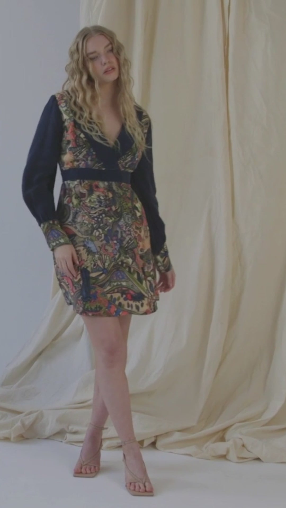 The Aria Persian hand painted long-sleeve mini dress is part of Sarvin’s eco-friendly collection and a sister design to the Larica maxi. Featuring an exclusive hand-drawn Persian artwork by Ali Fani Salek, the print is digitally applied to sustainable Cupro fabric, creating a luxurious silk-like feel with soft fluid movement. Designed with a plunging V-neckline, puffed sleeves, and a defined waistband, Aria flatters the figure while offering effortless elegance. Cut mid-thigh, it is perfect for day-to-night styling. For a full-length alternative, discover the Larica maxi dress in the same print.