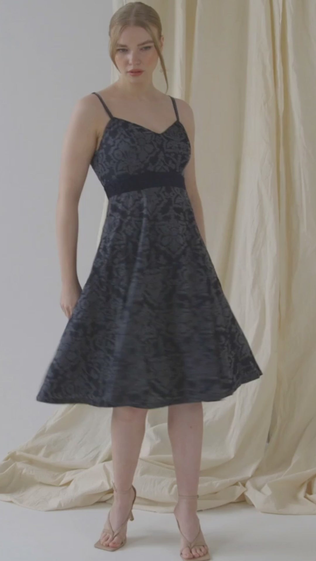 The Nina jacquard skater dress is a sophisticated nod to the ’60s, reimagined in a contemporary eco-friendly fabric. Crafted from unique navy jacquard woven with sustainable yarn, this fit-and-flare design features elegant adjustable velvet straps for the perfect fit. A velvet waistband defines the bodice, while underwired cups offer extra support. Feminine, flattering, and versatile, Nina is perfect for weddings, parties, and chic day-to-evening occasions.