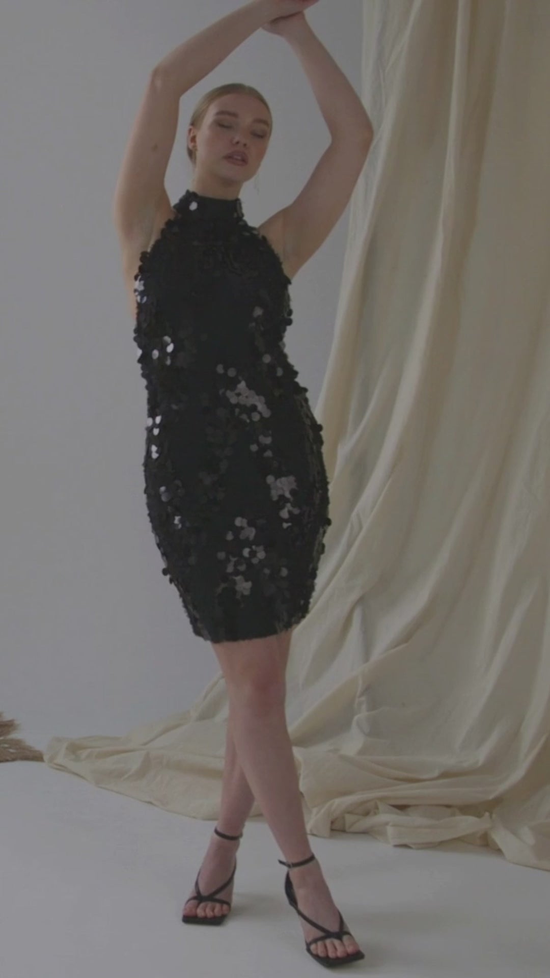 The Siah sparkly black dress is a statement LBD with a backless fitted silhouette and high neckline. Crafted from metallic sequinned mesh and fully lined in sheer jersey, this glittering mini dress offers a sleek finish with a dramatic low scooping back. Featuring a concealed hook-and-eye fastening, Siah is the perfect party dress for cocktail nights, festive events, and special occasions.